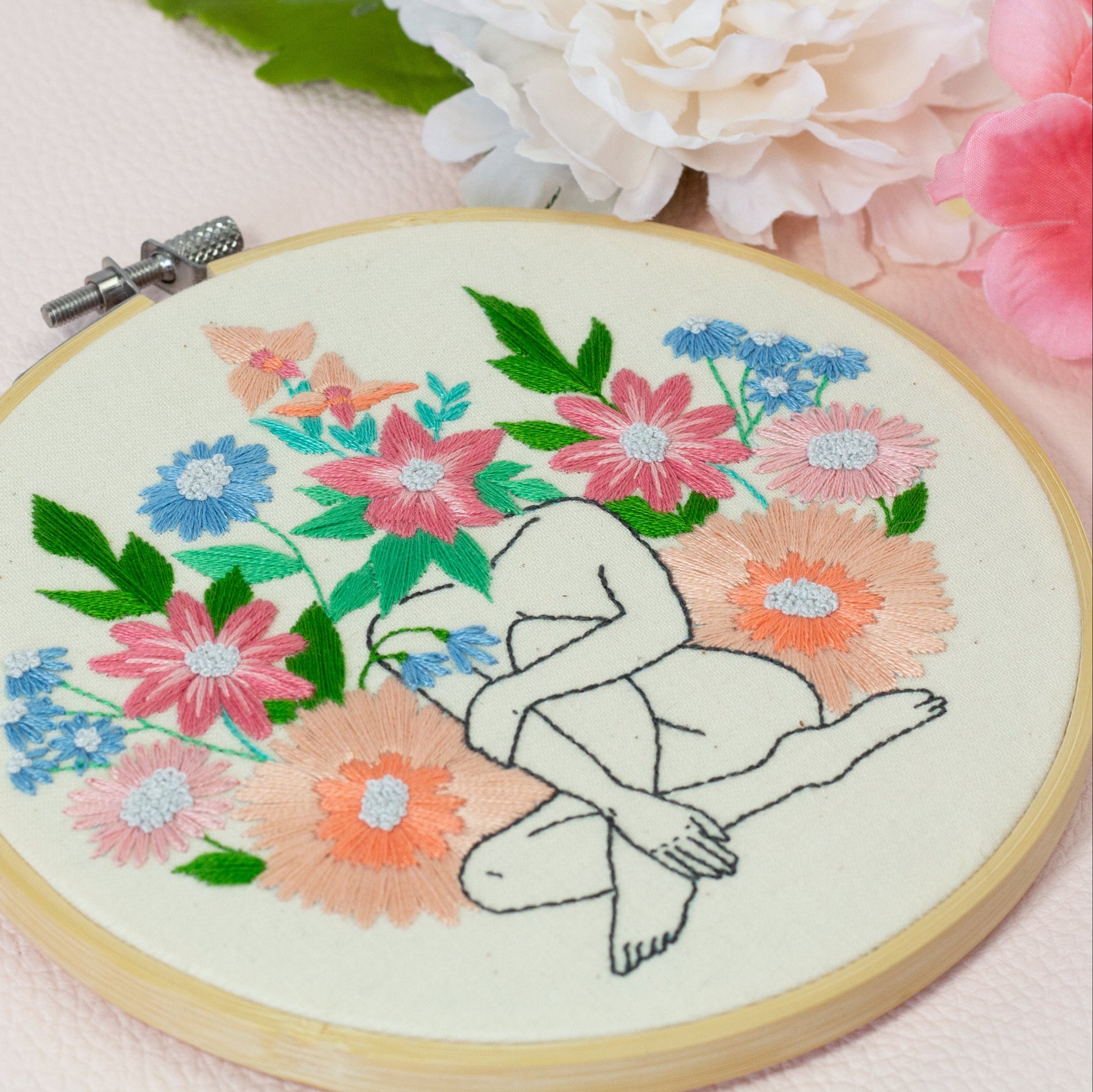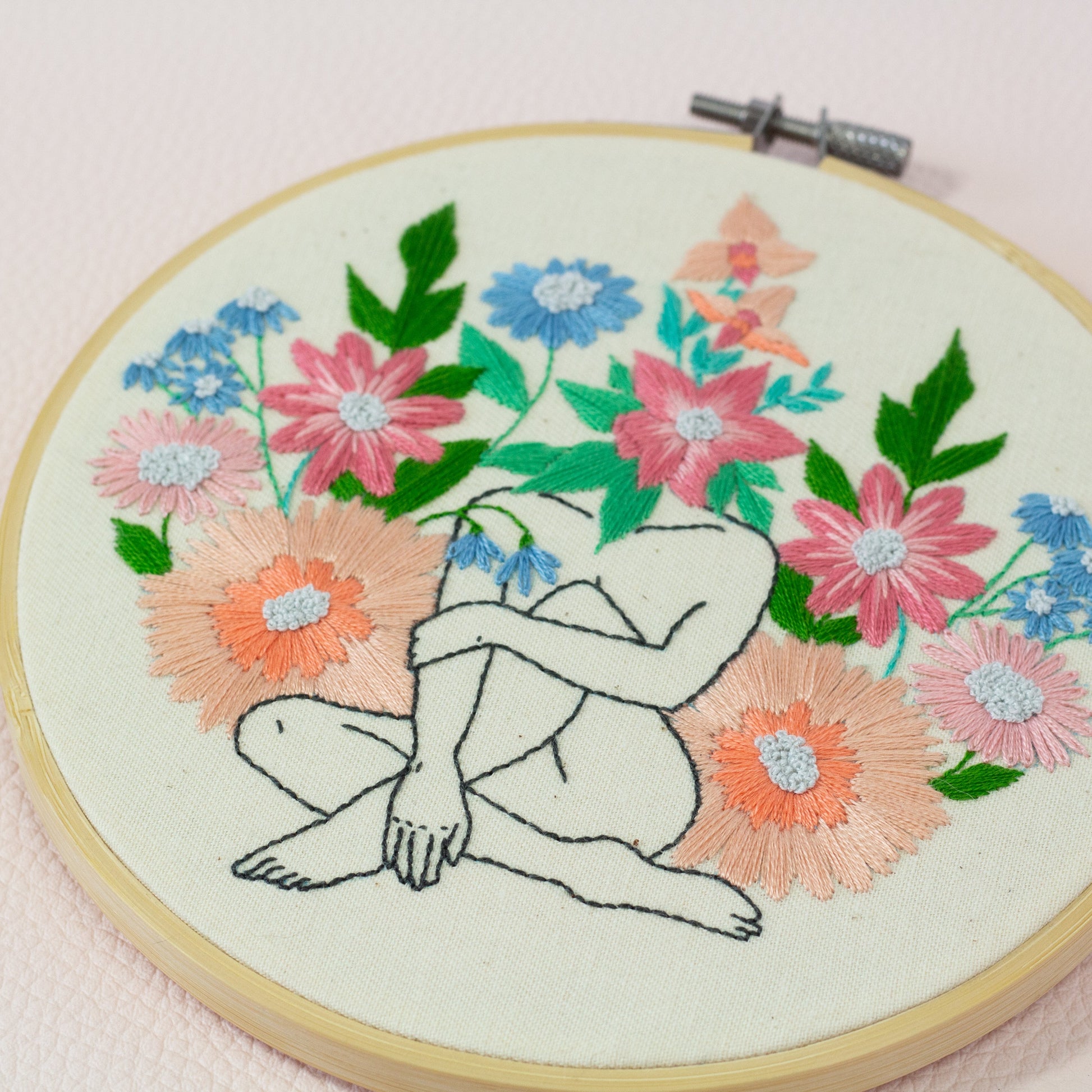 She’s soft, she’s strong, she’s in full bloom. 🌸✨ This hand-stitched 6-inch hoop features a delicate line-art figure with a bouquet of vibrant florals where her thoughts would be—because growth, creativity, and self-discovery start from within.