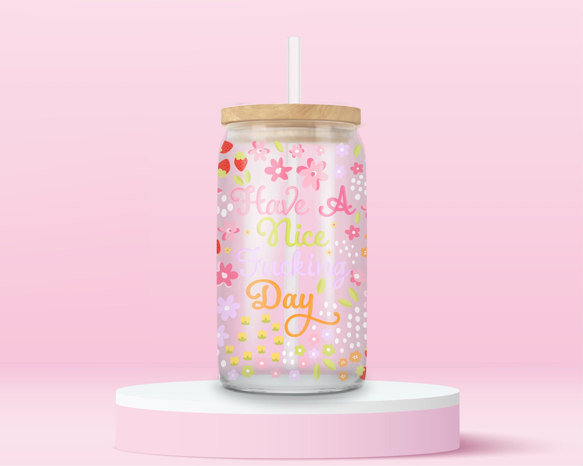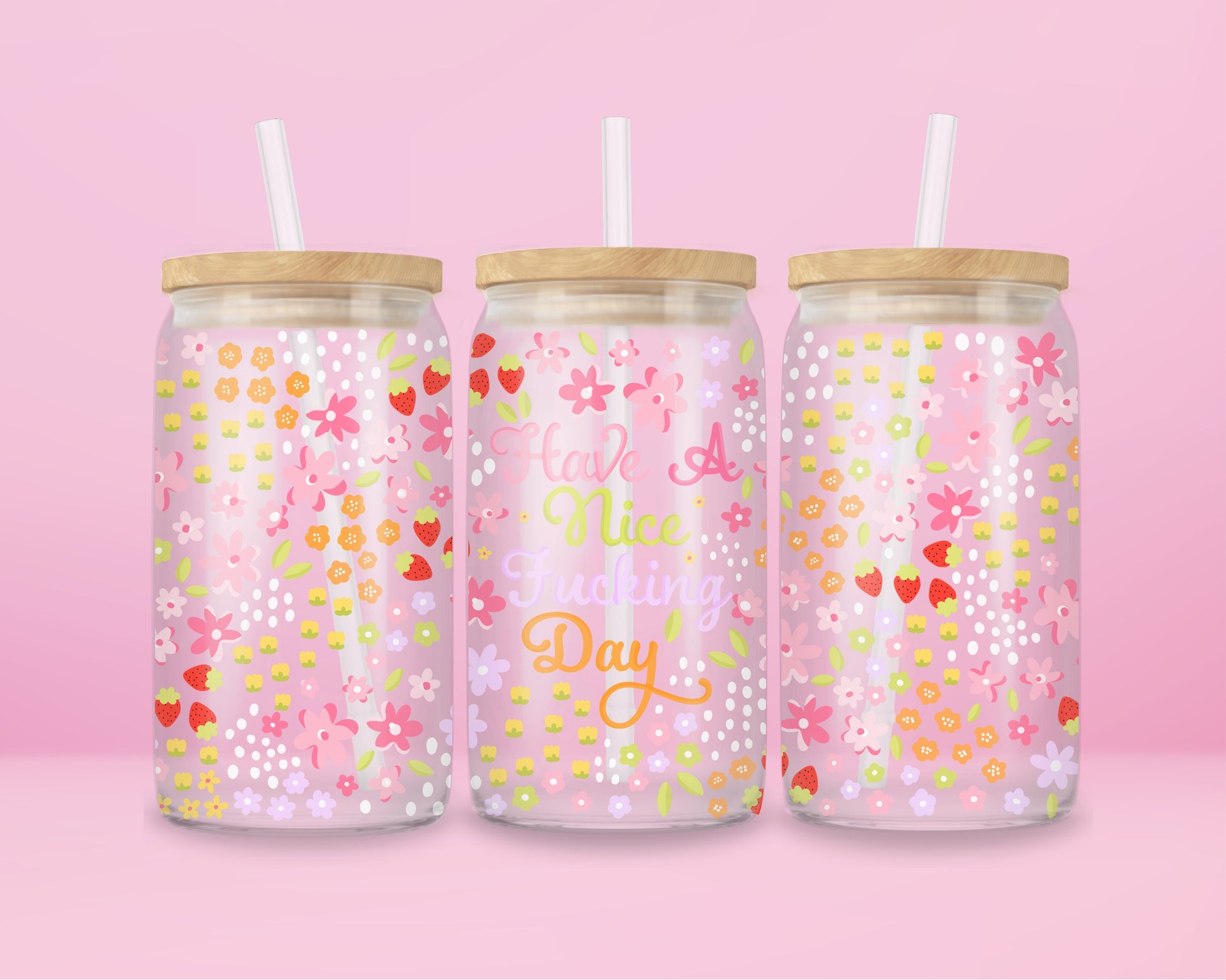Start your morning with sass and sparkle ✨ This pink floral glass can tumbler is sprinkled with strawberries, pastel blooms, and polka dot details — plus the bold reminder to “Have a Nice Fcking Day.”* Perfect for iced coffee, matcha, or your go-to girl dinner drink, it’s equal parts sweet and savage 💕