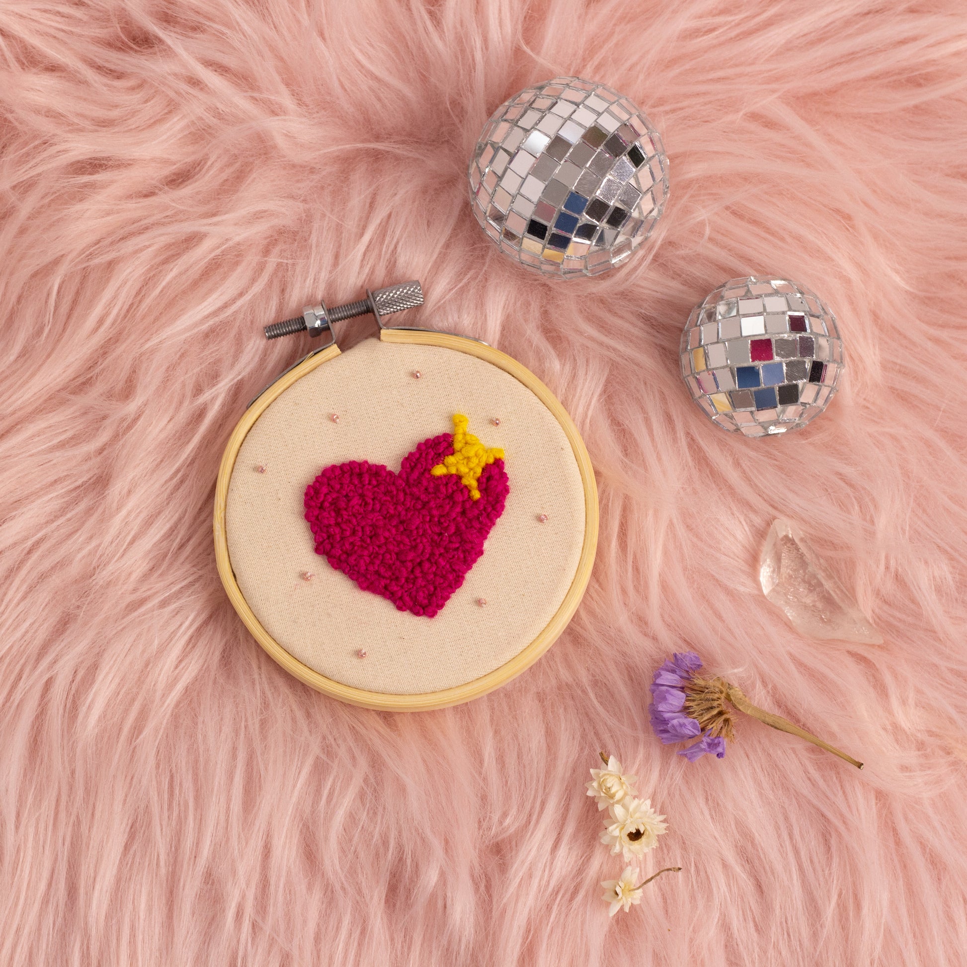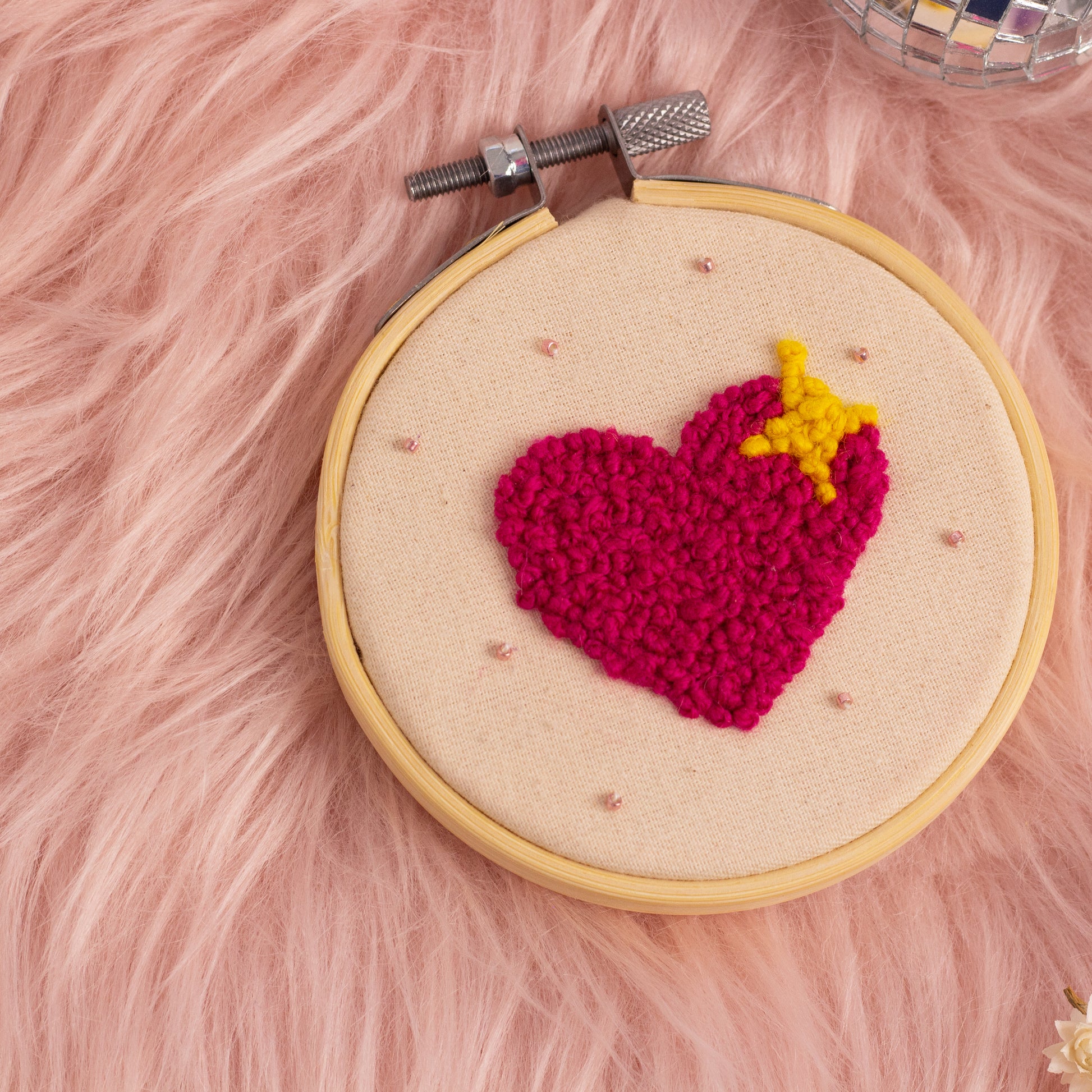 This heart with a starry twist is sure to capture your heart (pun intended!). Made with French knots in deep pinks and a pop of yellow, this cute little design will remind you to always follow your heart—and sprinkle in some magic while you're at it! 🌟
