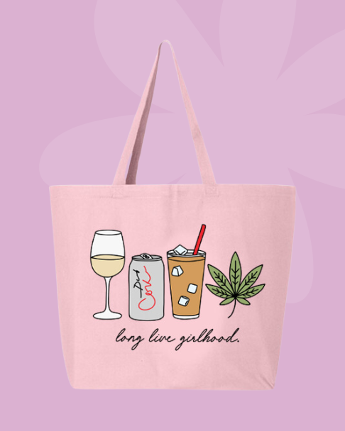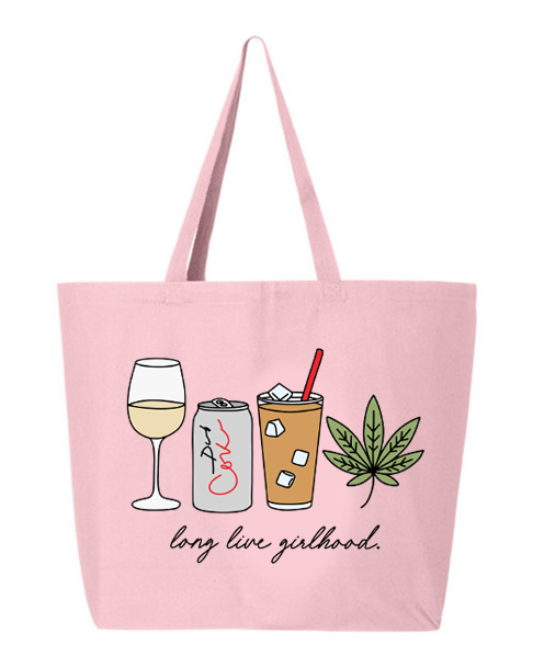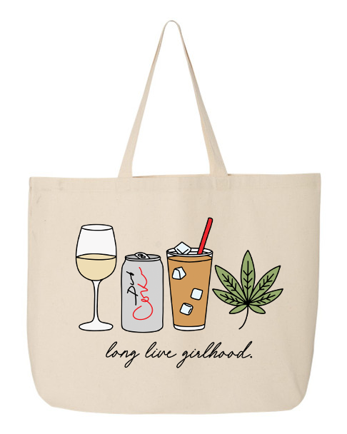 Celebrate the bold, unapologetic essence of girlhood with the Long Live Girlhood Tote! Featuring a row of icons—white wine, Diet Coke, iced coffee, and a marijuana leaf—this tote is perfect for those who embrace all the joys of girlhood, no matter how quirky. Whether you're sipping your drink of choice or just living your best life, this tote lets you show off your personality in style.