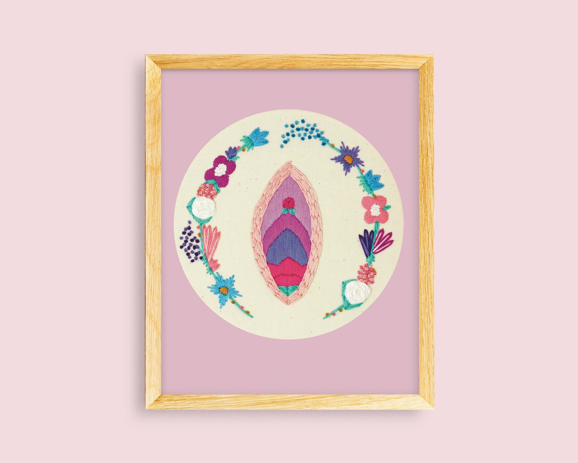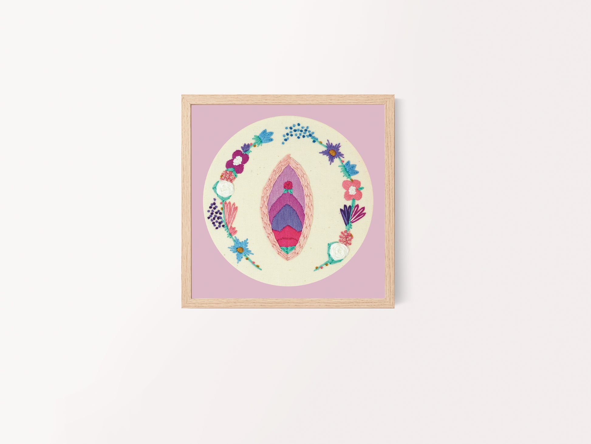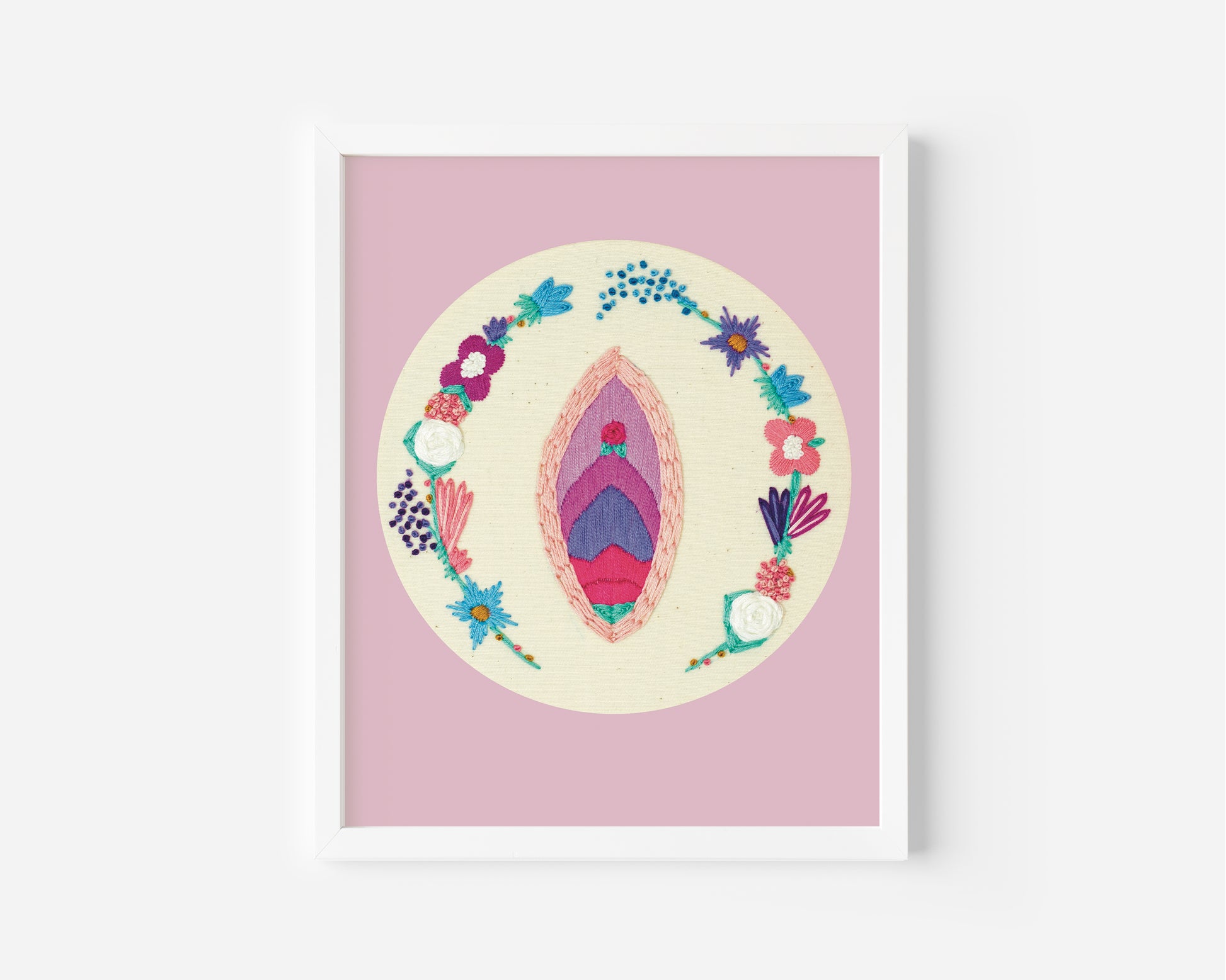 Pink Aesthetic Vulva Flower Embroidery Print – Feminist Floral Wall Decor 🌸💖
