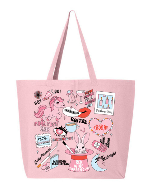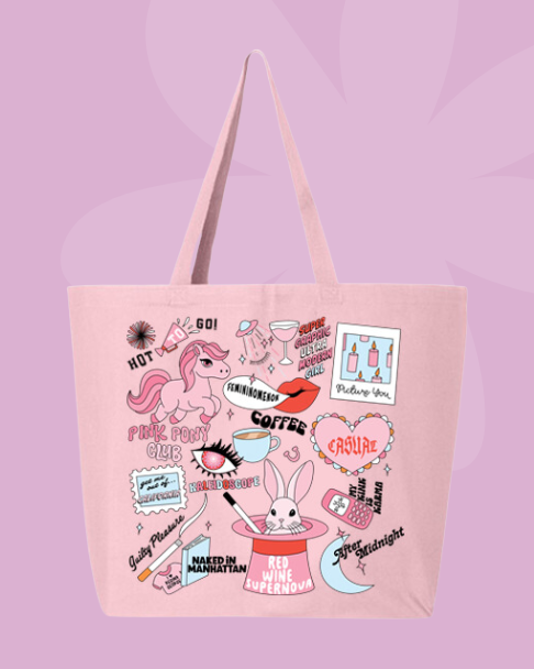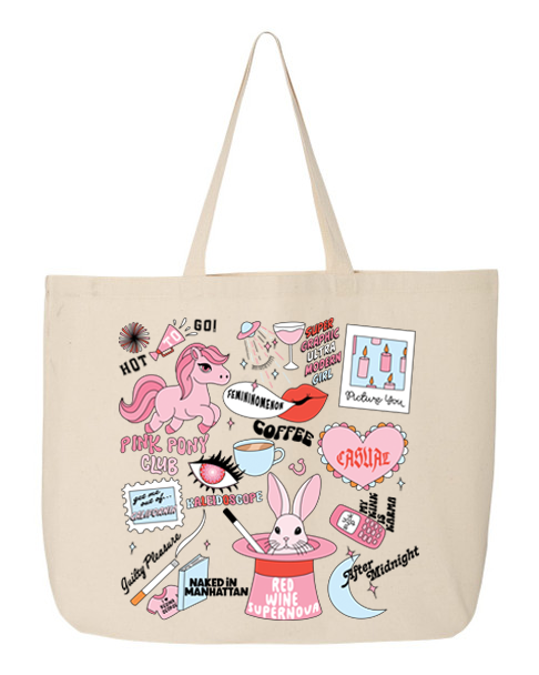 Step into the Pink Pony Club with this vibrant tote inspired by Chappell Roan’s most-loved tracks! Perfect for carrying your essentials to concerts, coffee shop hangs, or any adventure where you’re ready to show your pride and playlist. This tote is as bold and colorful as Chappell’s music.