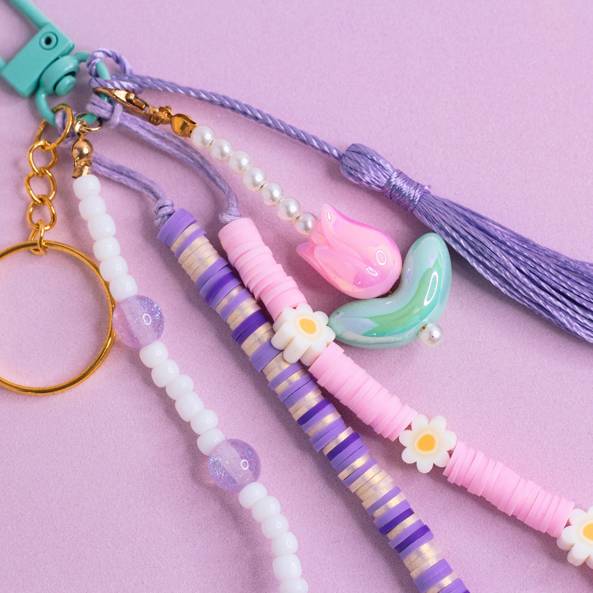A whimsical floral purse charm with pastel tulip beads, daisies, and shimmer tassel. The perfect dreamy add-on for your tote or backpack.