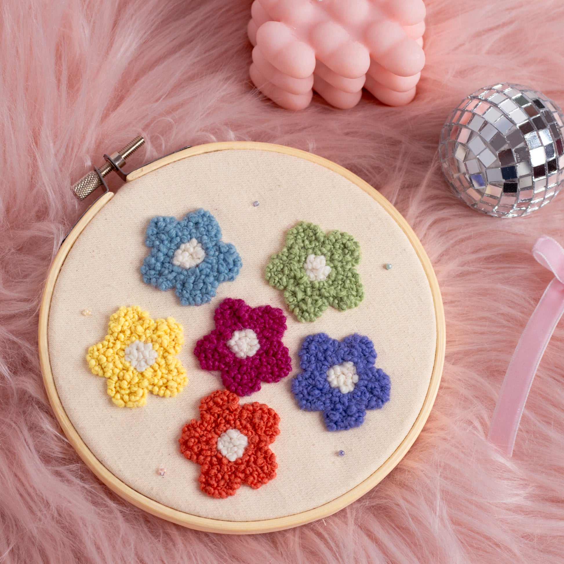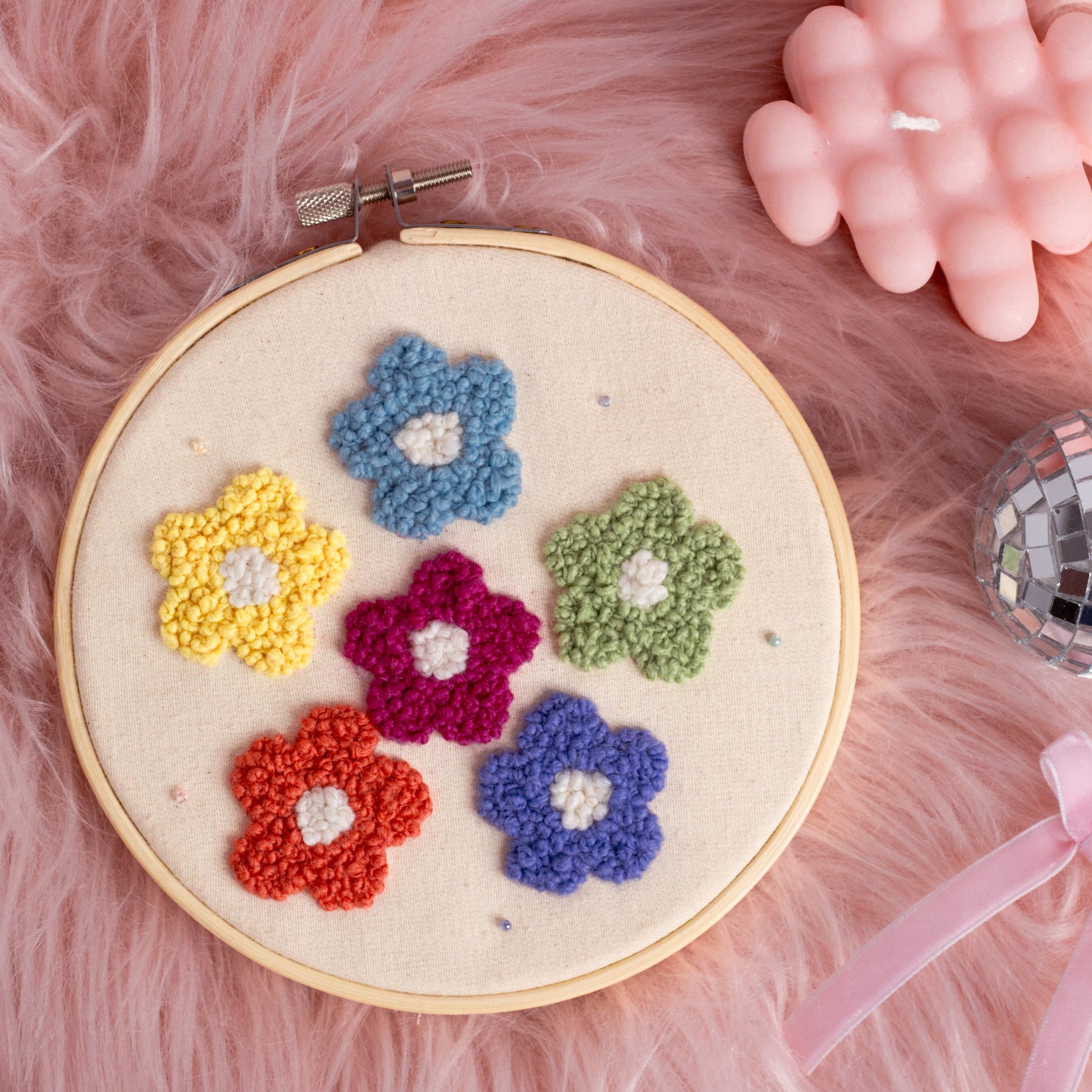 A little floral fun just for you! With vibrant rainbow flowers and a cream-colored base, this adorable French knot daisy design will brighten up any room. Add a burst of color and feel all the good vibes with this flower power hoop! 🌷🌈